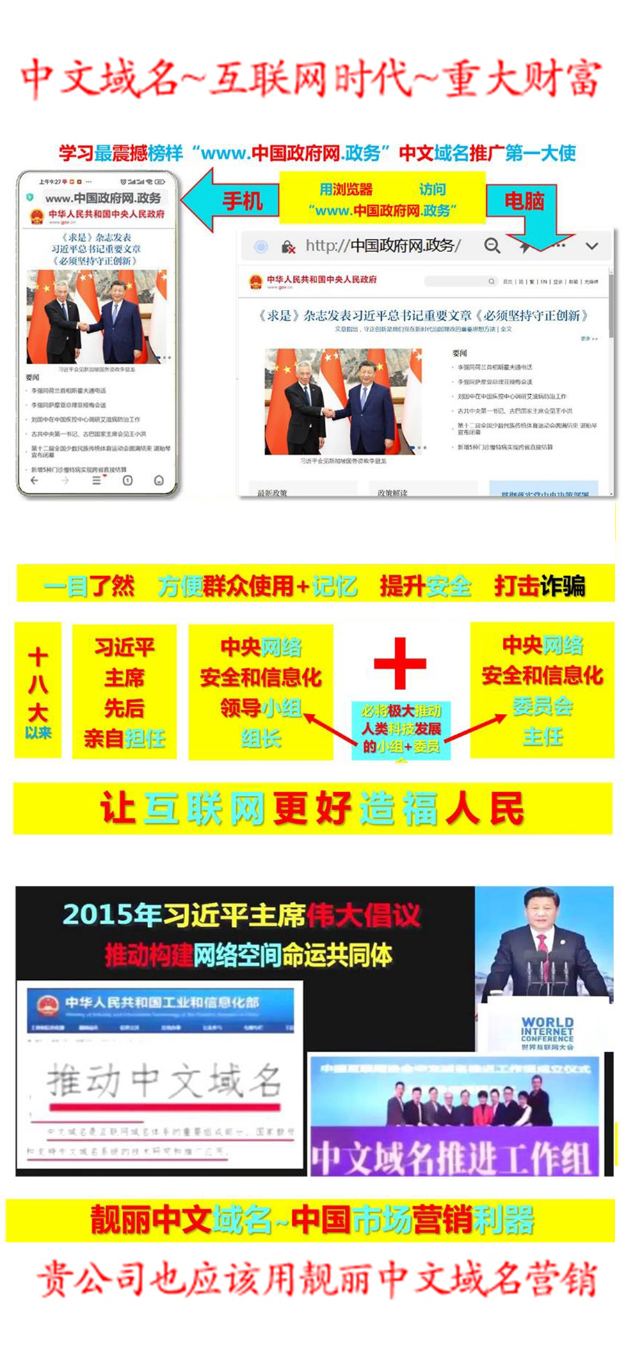 我公司所有下列靓丽的战略域名 www.智.TOP www.wonder.TOP www.具身智能.com www.中国队加油.TOP www.服务机器人.TOP 正在全国进行营销合作 为演示通路现暂友情链接到贵公司的网站主页 点击了解详情 此营销方案的大背景 中国政府大力推动中文域名应用 www.中国政府网.政务~中文域名第一推广大使 点击了解详情 **************************************************